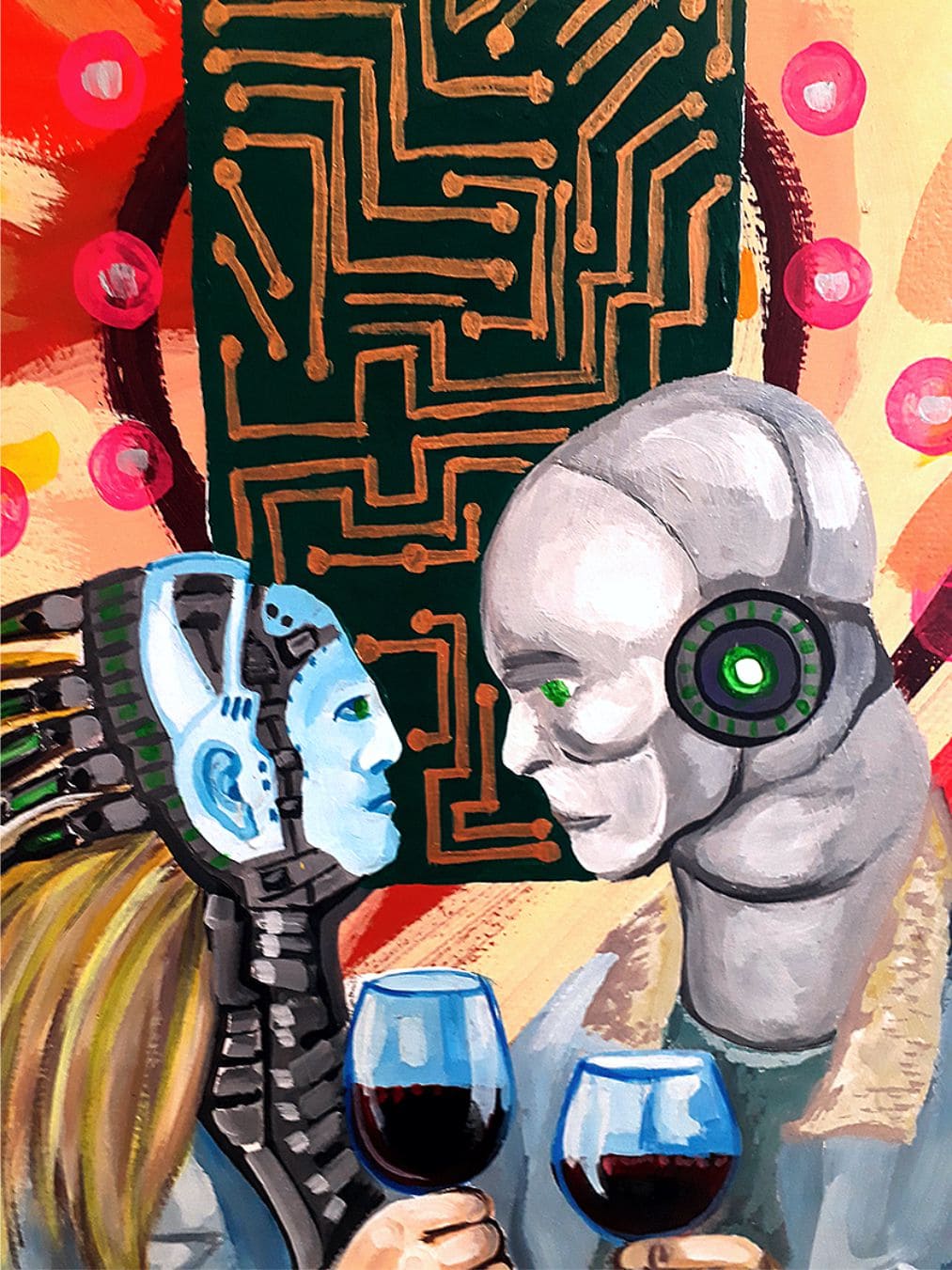 Androides y vinos es una conjunción sumamente atractiva. Es evidente en el trabajo de Daniel su amor por la tecnología. Una robótica de control como en el caso de “robot degustador” / control de calidad / pero también de éxtasis como: “vino a punto” y de amor como en el caso de la obra “Brindis electrónico de chip”.