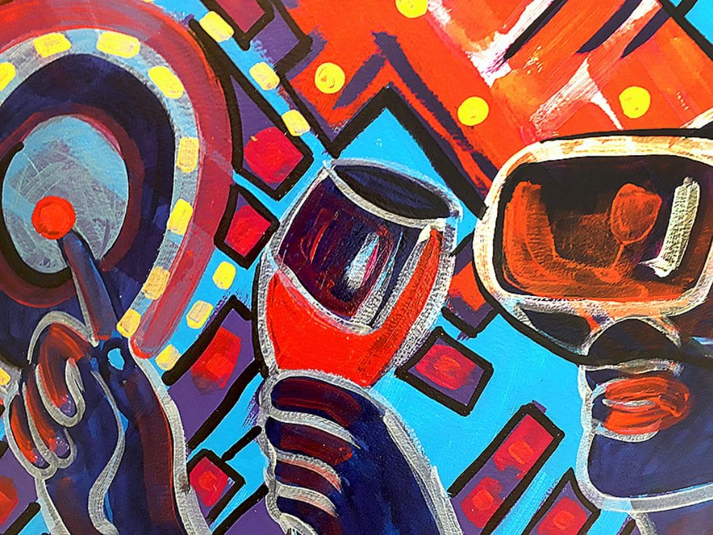Me detuve en la primera sala, sobre la obra “Metavinerso, robot degustador”, un acrílico de 91 x 130 cm donde un androide sommelier parece disfrutar de un gran copón de vino tinto. Con colores vívidos y fulgurantes, la máquina casi humana parece entender y disfrutar del brebaje. Hay una mirada picaresca, una sonrisa cómplice en su rostro, dibujado con trazados limpios y precisos. Clama a gritos: Soy un Balderramo auténtico, soy pop y quiero fiesta. Inmediatamente mi cyberpunk interior comenzó a recordarme charlas / copas mediante / con amigos / de un futuro amenazador, donde las máquinas controlaban al hombre. Sin reflexionar al respecto pasé de inmediato a “Metavinerso, vino a punto” donde una mujer con un casco de realidad aumentada parecía activar con su dedo índice un clítoris envuelto en explosiones de colores; un éxtasis, a click de activación, lo que me llamó a reflexionar sobre el poder de las máquinas en la construcción de paraísos. Un artilugio que, maridado con vino, puede hacernos llegar al nirvana.